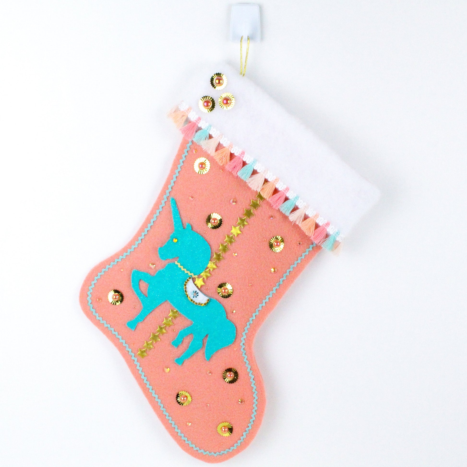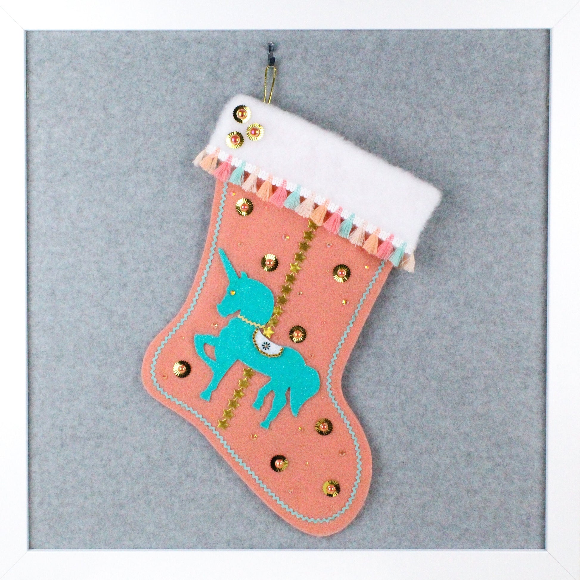 Horse: Aqua felt with bright aqua glitter paint on both body and horn.