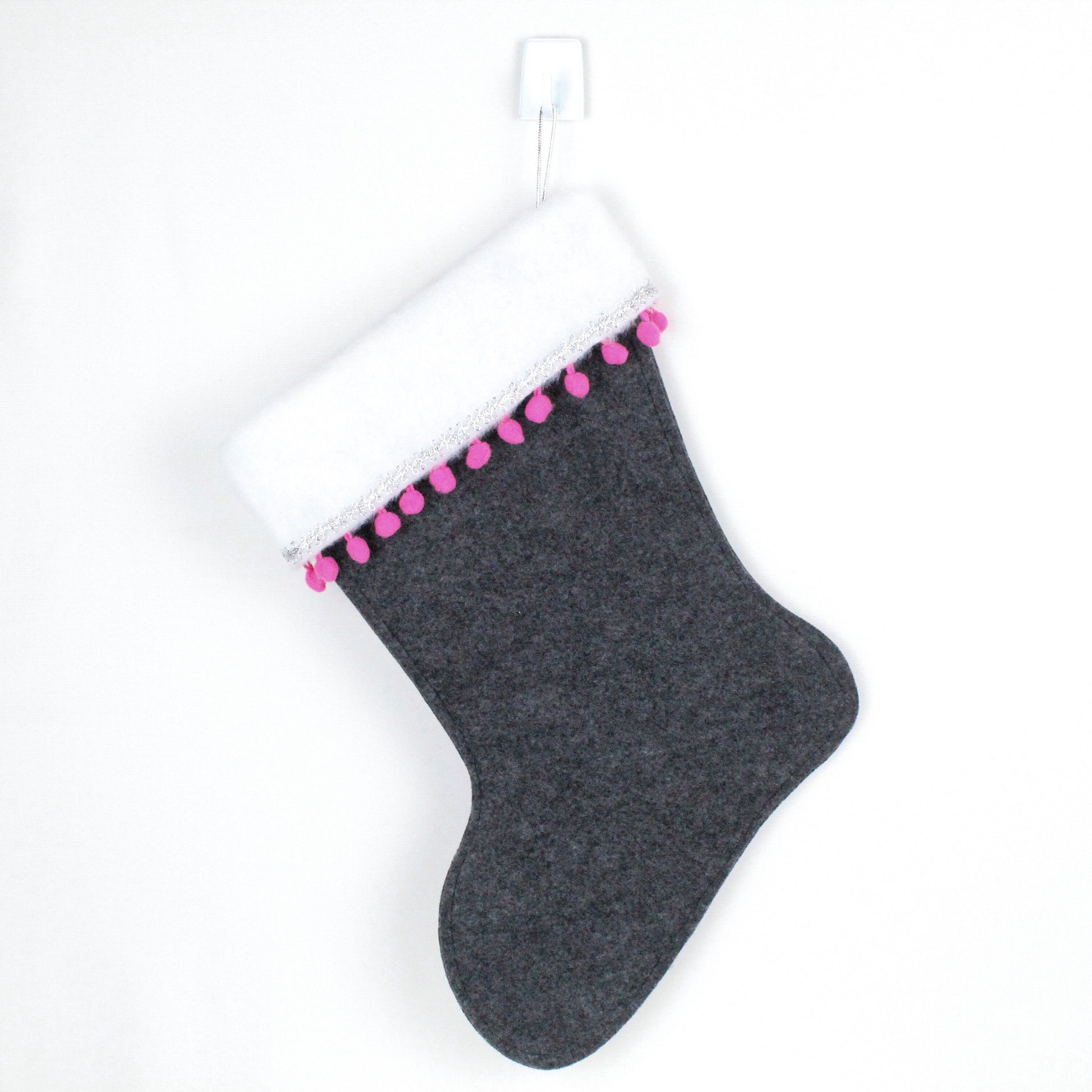 The stockings have an overall dimension of 14" tall x 10.5" wide. See photo for details. The inside dimensions are approximately 11 3/8" H from the mouth of the stocking to the heel; 6 1/2" W at the mouth of the stocking, 5 3/4" wide at the middle; about 9" wide from heel to toe. I did try to make the stocking wider but this is as wide as I can go without distorting the stocking shape. The hang tag (also longer than before!) extends about 1 3/4" from the stocking. The hang tag (either silver or gold - see photos) cannot be changed. These are made with metallic cording and are strongly sewn onto the felt and within the fur so that they can support the stocking with items inside of it. Each stocking has a Kukukitchoo tag sewn into the top of the stocking (see sample photo). This is how you know it's the real deal and from my studio.
