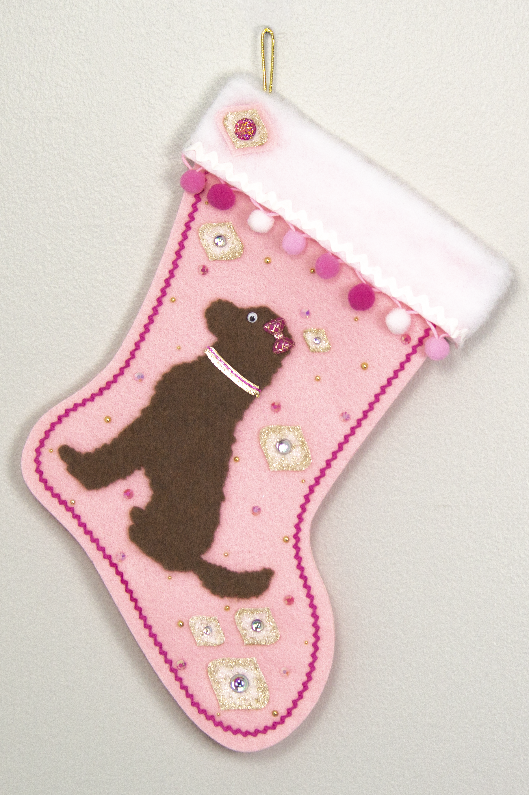 Chocolate Labradoodle dog on pink felt Christmas stocking