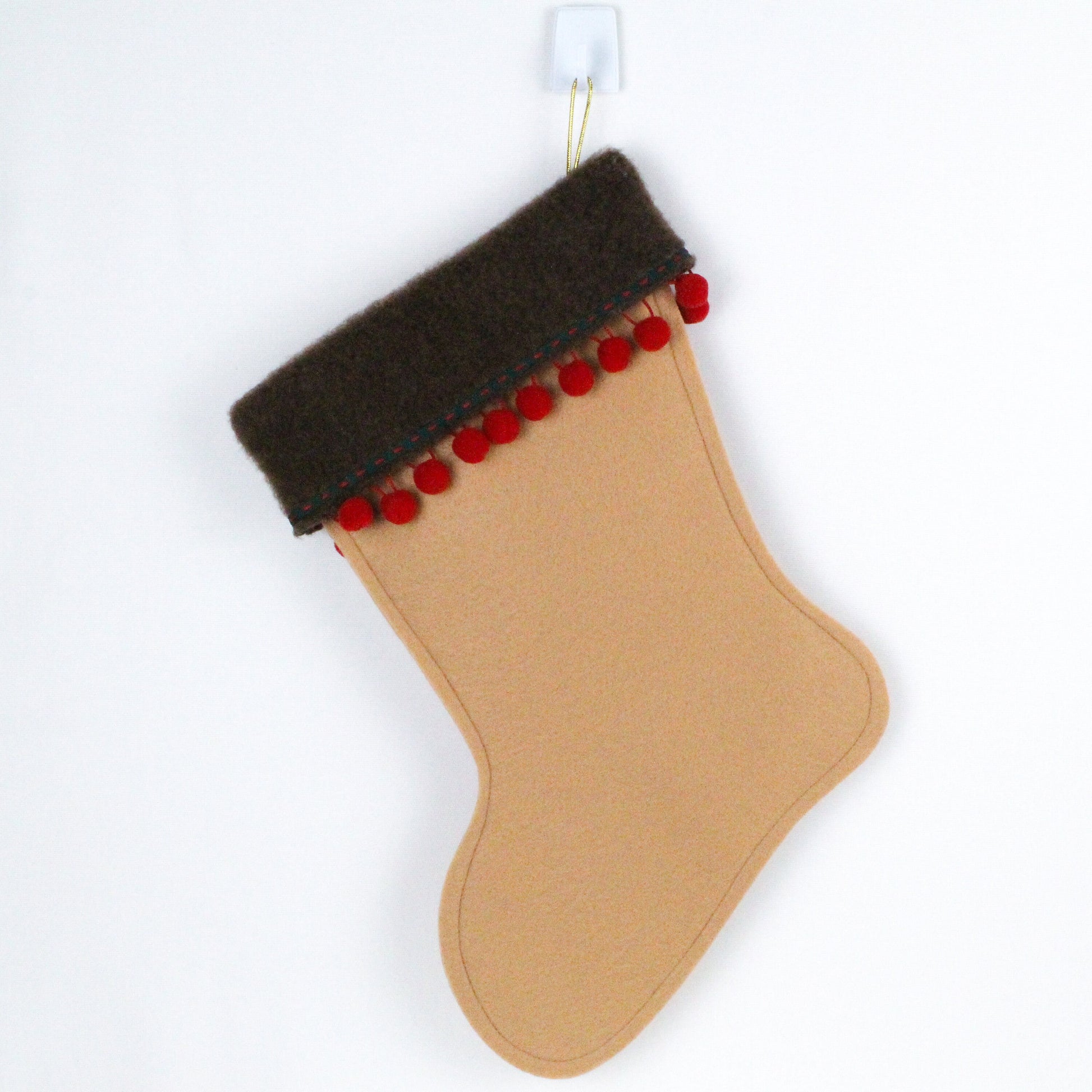 The stockings have an overall dimension of 14" tall x 10.5" wide. See photo for details. The inside dimensions are approximately 11 3/8" H from the mouth of the stocking to the heel; 6 1/2" W at the mouth of the stocking, 5 3/4" wide at the middle; about 9" wide from heel to toe. I did try to make the stocking wider but this is as wide as I can go without distorting the stocking shape. The hang tag (also longer than before!) extends about 1 3/4" from the stocking. The hang tag (either silver or gold - see photos) cannot be changed. These are made with metallic cording and are strongly sewn onto the felt and within the fur so that they can support the stocking with items inside of it. Each stocking has a Kukukitchoo tag sewn into the top of the stocking (see sample photo). This is how you know it's the real deal and from my studio.