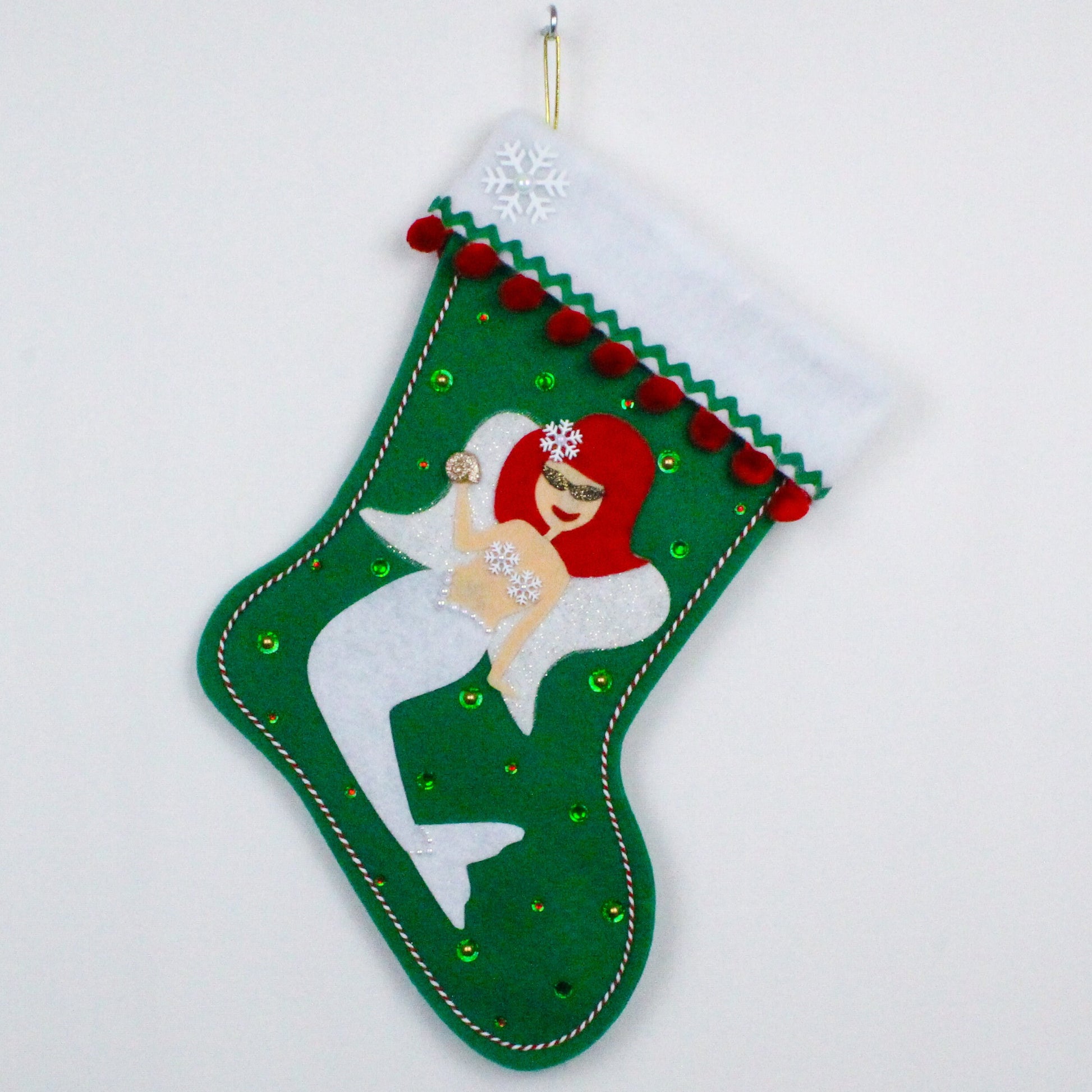 Kukukitchoo stockings are made by (me!) Tonya Newton. From sewing, sketching, gluing/crafting, to selling .. each and every stocking I make is handmade and one of a kind. I never repeat the same character/decoration twice, unless I'm asked to and even then it's never an exact match. The stocking bases are either a solid or glittered polyester felt. These are cut and glued around the edges, then machine stitched. The faux fur at the top of the stocking is sewn onto the felt and is made of Eco-fi, a high-quality fiber that is created from 100% post-consumer recycled and BPA-free plastic bottles. The front stitches on each stocking are covered with trim. Decorative items used on the stockings are either purchased new or thrifted. I put every single stocking through a complete shake and pluck test once I'm done decorating and it's dry. A second shake test is done at the time of packaging. If something isn't right, I fix it before it's shipped. I want to be sure you're getting a quality product. And in case you're wondering .. the stockings ARE fully functional. You can use them for holding items, gifting or for just display. The stockings have an overall dimension of 14" tall x 10.5" wide. The inside dimensions are approximately 11 3/8" H from the mouth of the stocking to the heel; 6 1/2" W at the mouth of the stocking, 5 3/4" wide at the middle; about 9" wide from heel to toe. The hang tag extends about 1 3/4" from the stocking. The hang tag is cording and is strongly sewn onto the felt and within the fur so that it can support the stocking with items inside of it.