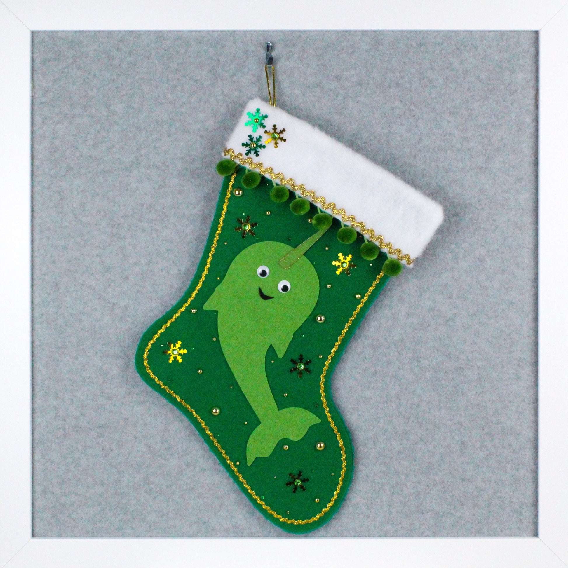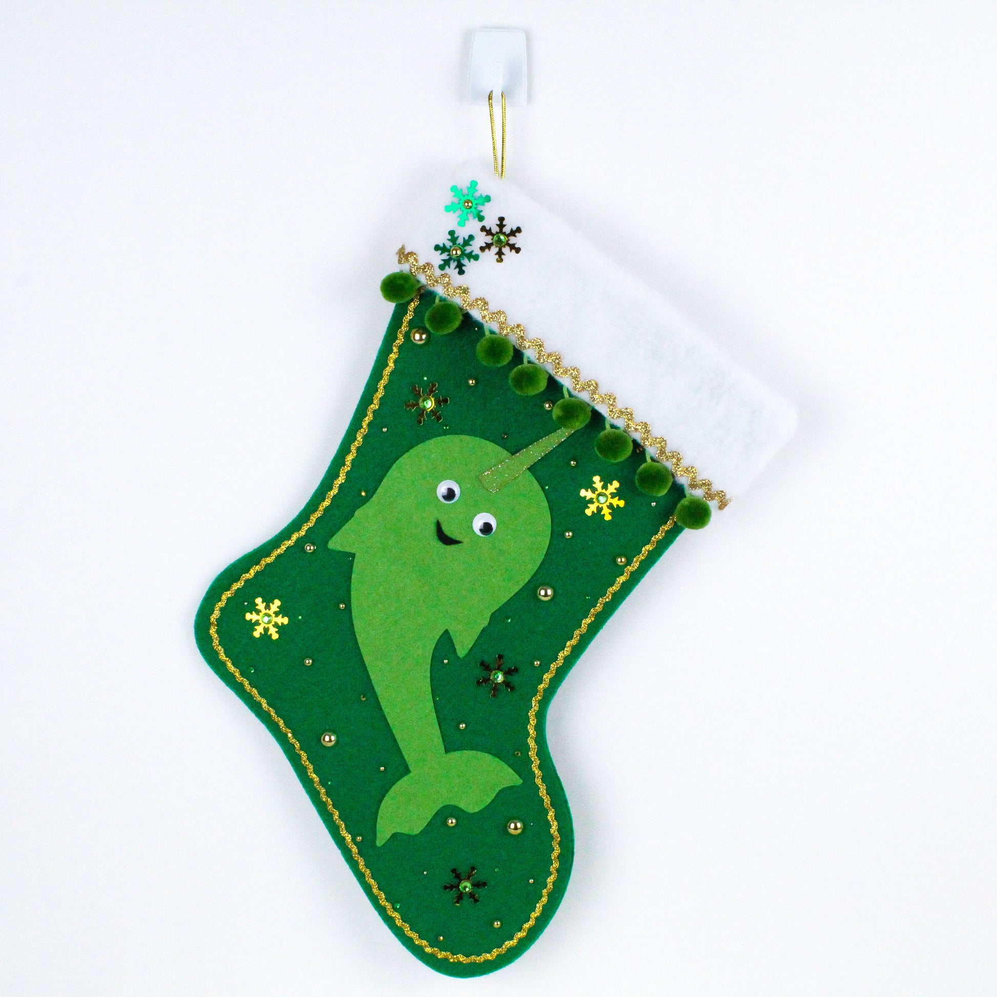 Narwhal: Green felt and tusk that's lightly outlined and brushed with gold glitter paint.