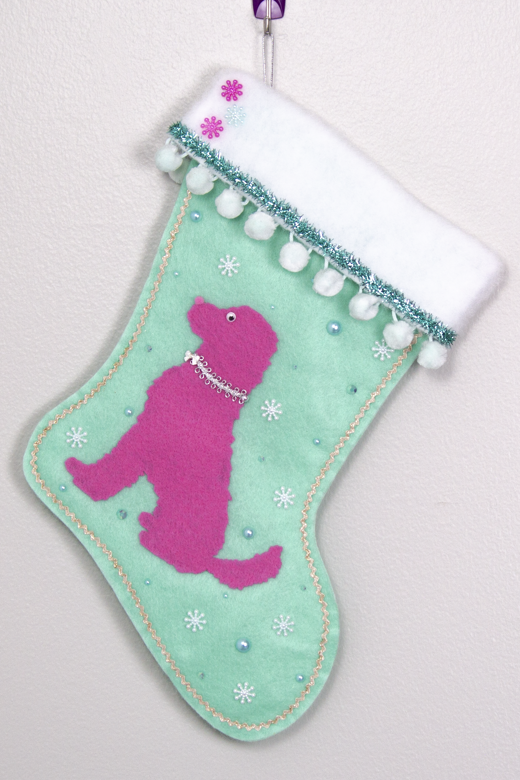 Pink Labradoodle dog on mint green felt Christmas stocking