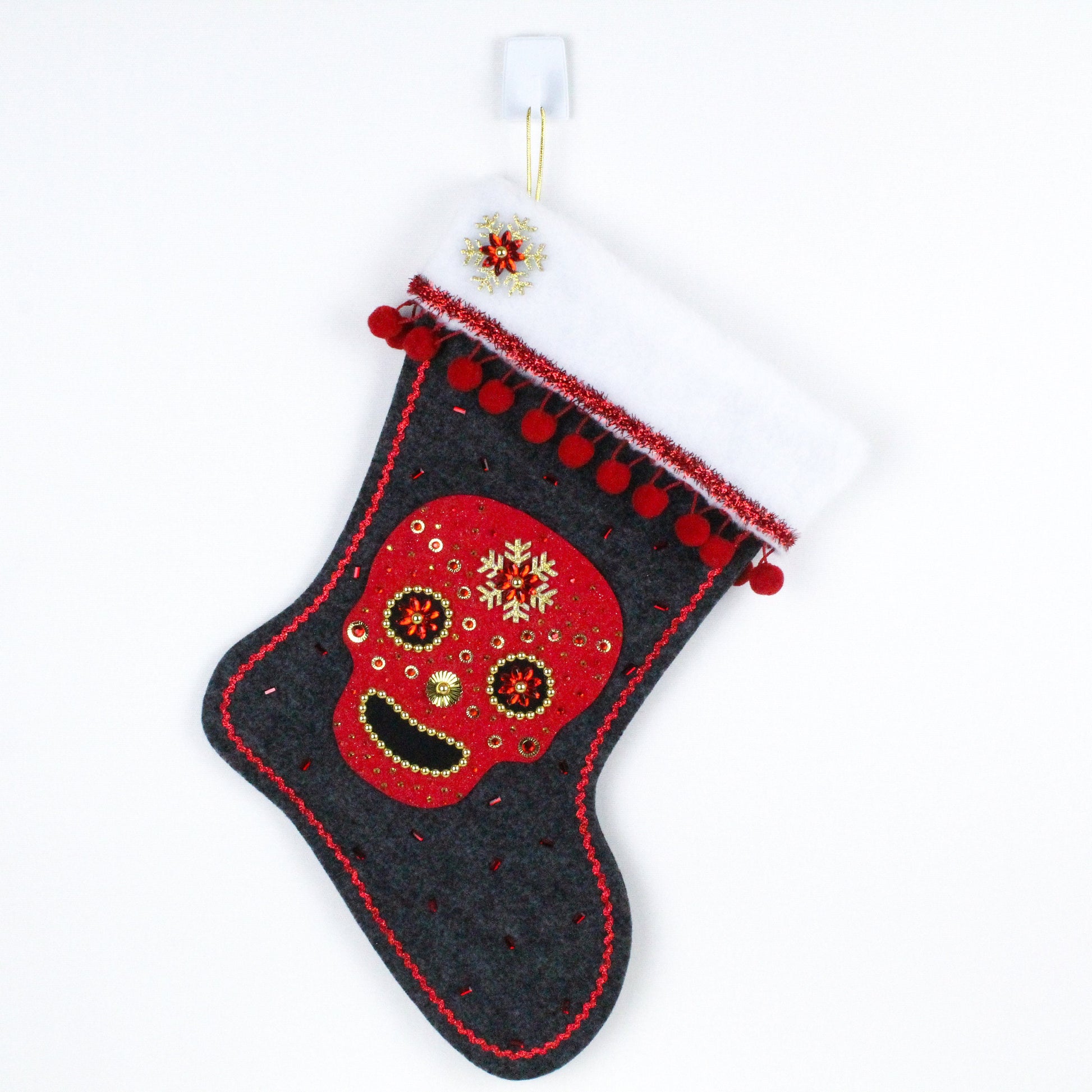 Kukukitchoo stockings are made by (me!) Tonya Newton. From sewing, sketching, gluing/crafting, to selling .. each and every stocking I make is handmade and one of a kind. I never repeat the same character/decoration twice, unless I'm asked to and even then it's never an exact match. The stocking bases are either a solid or glittered polyester felt. These are cut and glued around the edges, then machine stitched. The faux fur at the top of the stocking is sewn onto the felt and is made of Eco-fi, a high-quality fiber that is created from 100% post-consumer recycled and BPA-free plastic bottles. The front stitches on each stocking are covered with trim. Decorative items used on the stockings are either purchased new (a lot are from Etsy sellers) or thrifted. I put every single stocking through a complete shake and pluck test once I'm done decorating and it's dry. A second shake test is done at the time of packaging. If something isn't right, I fix it before it's shipped. I want to be sure you're getting a quality product. And in case you're wondering .. the stockings ARE fully functional. You can use them for holding items, gifting or for just display.